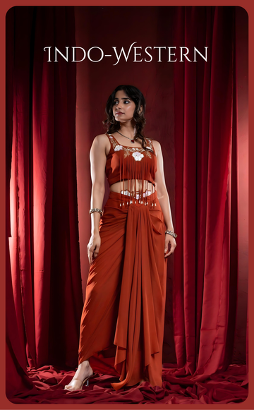 Celebrate the spirit of modern India with our signature Indo Western clothing, where cultural richness blends seamlessly with modern design. From chic Indo Western gowns for women and layered drapes to fusion jackets, skirts, and tunics, every outfit reimagines traditional silhouettes for today’s cosmopolitan woman. Whether you’re attending a wedding, festive gathering, or corporate event, our designer Indo Western wear ensures you look sophisticated and stylish. Crafted from fine fabrics like organza, silk, and georgette, these pieces bring comfort without compromising elegance — perfect for Diwali outfits for women and receptions.