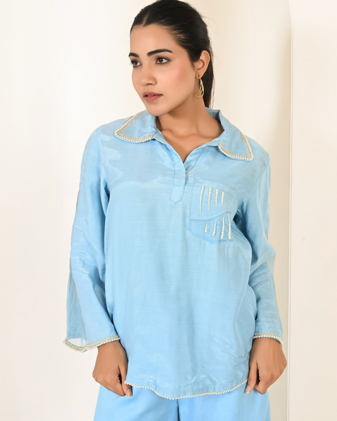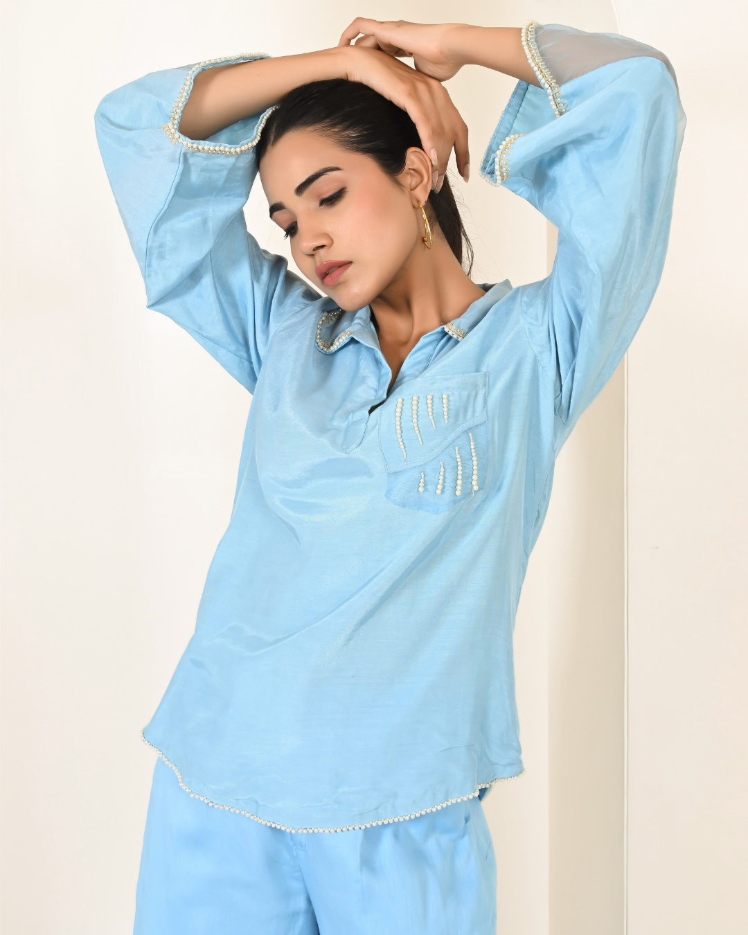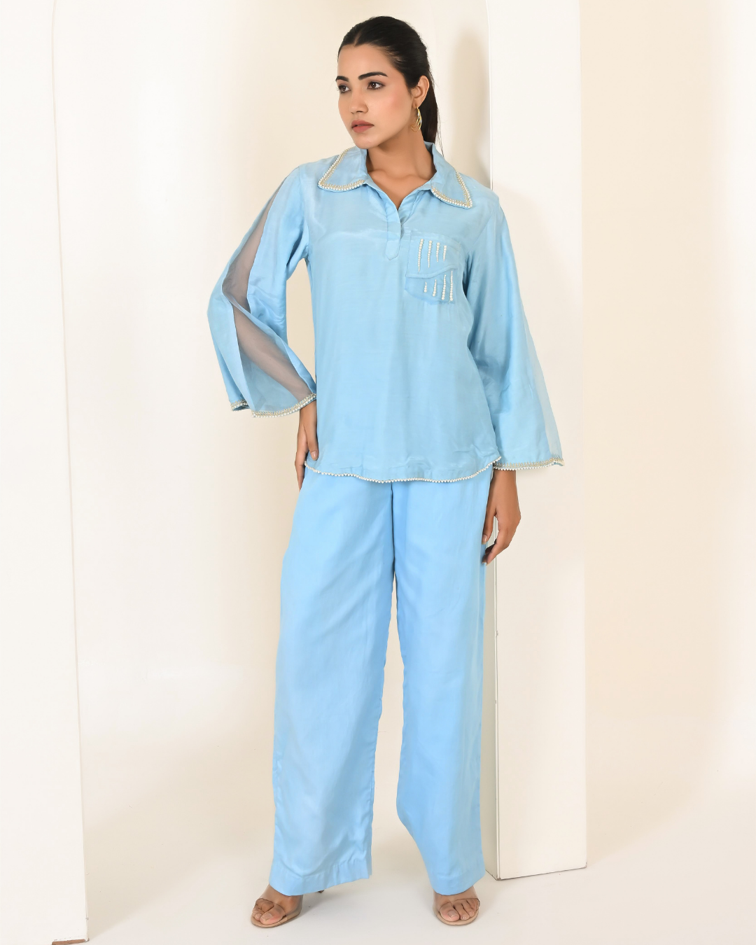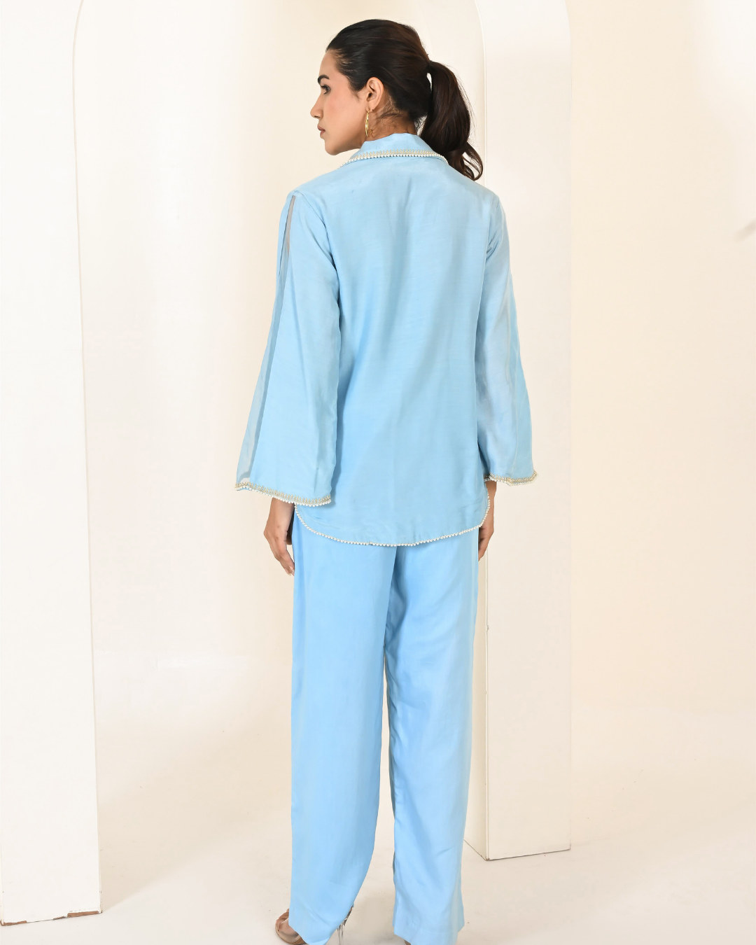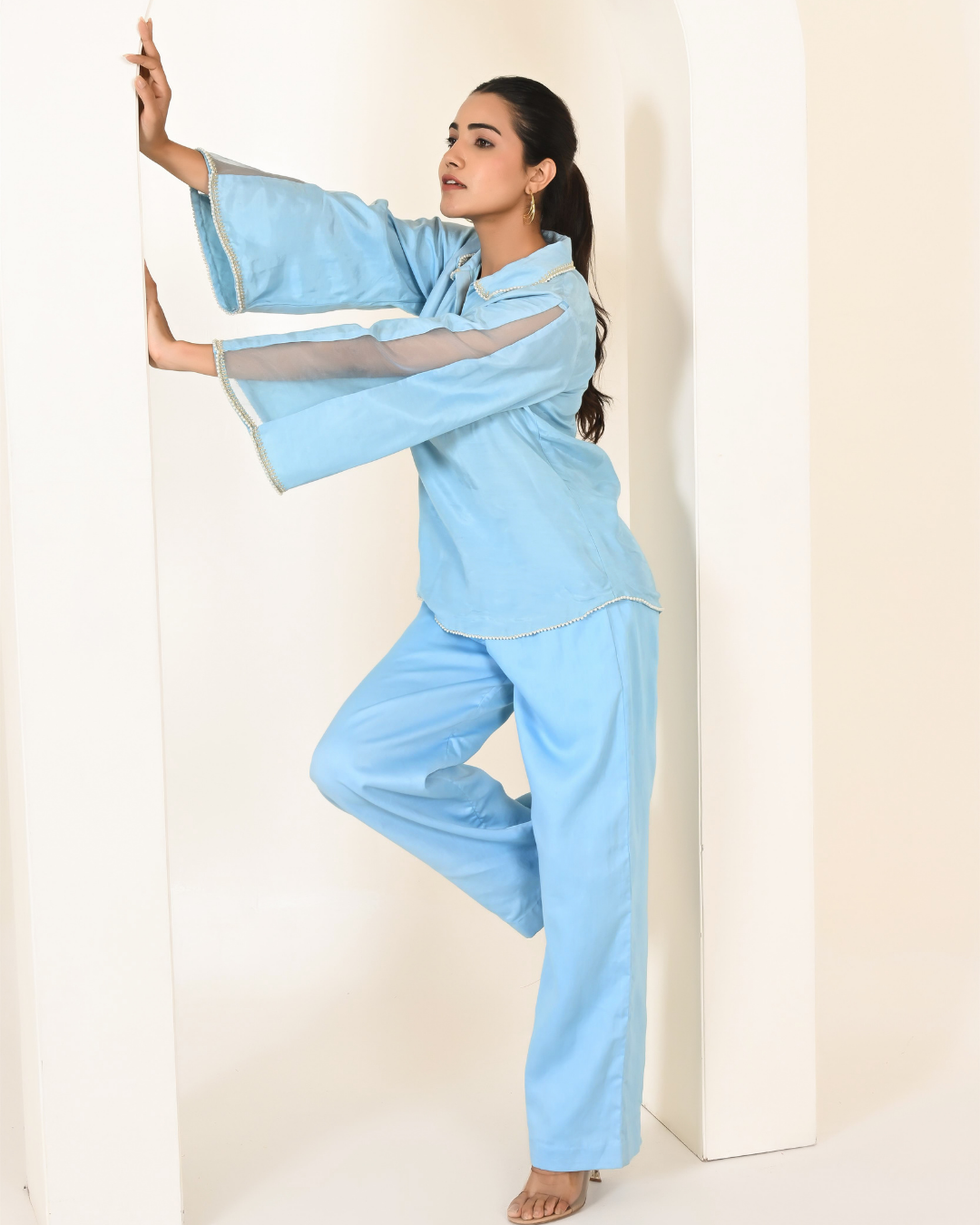 Elevate your style with the ethereal elegance of the Baby Blue Silk Cord Set.