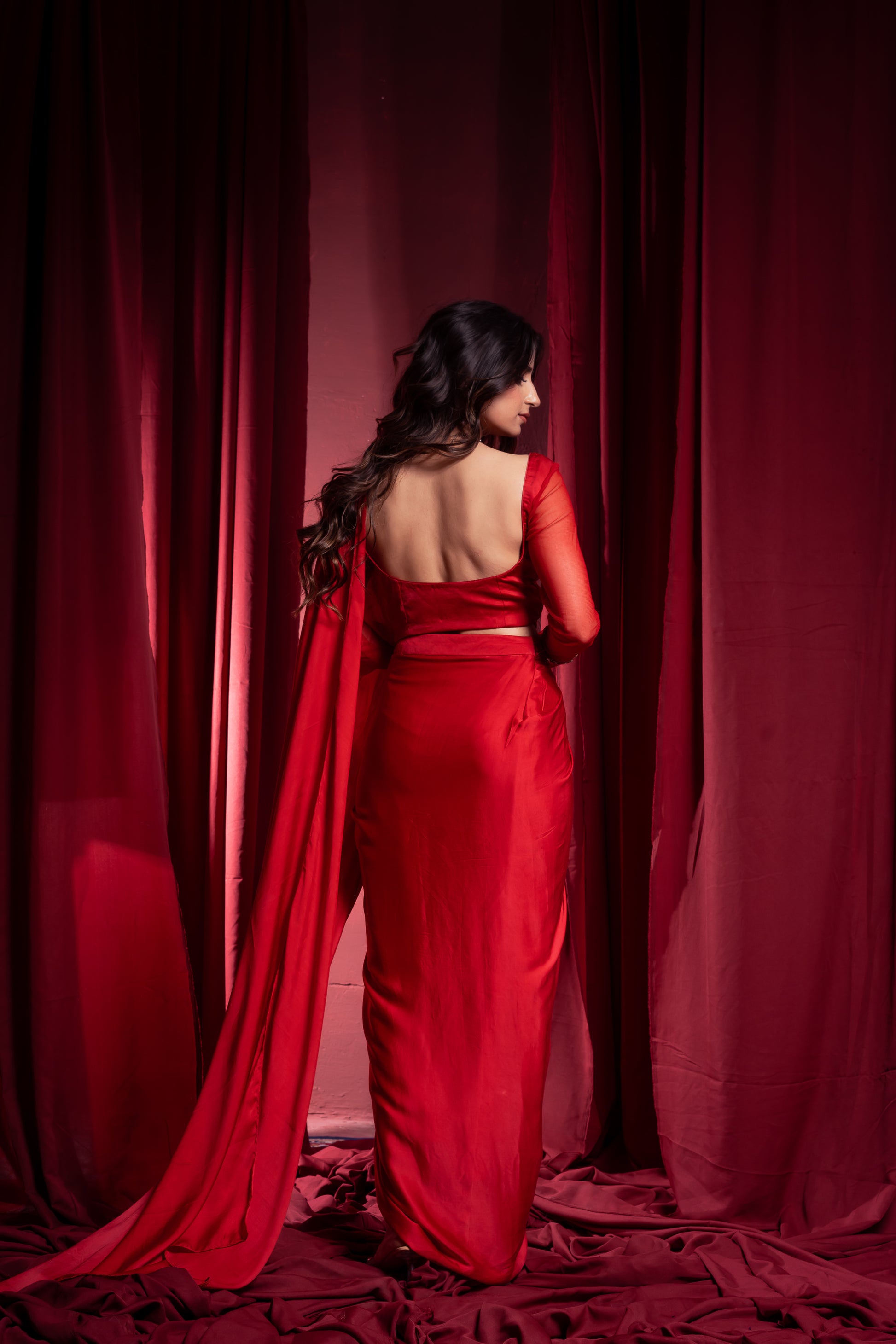 Make a bold statement with this striking crimson red pre-draped saree, paired with a beautifully full sleeves blouse. The fluid drape, rich fabric, and contemporary design make it perfect for cocktail nights, festive occasions, and wedding receptions. Its chic silhouette combines traditional grace with modern sophistication.