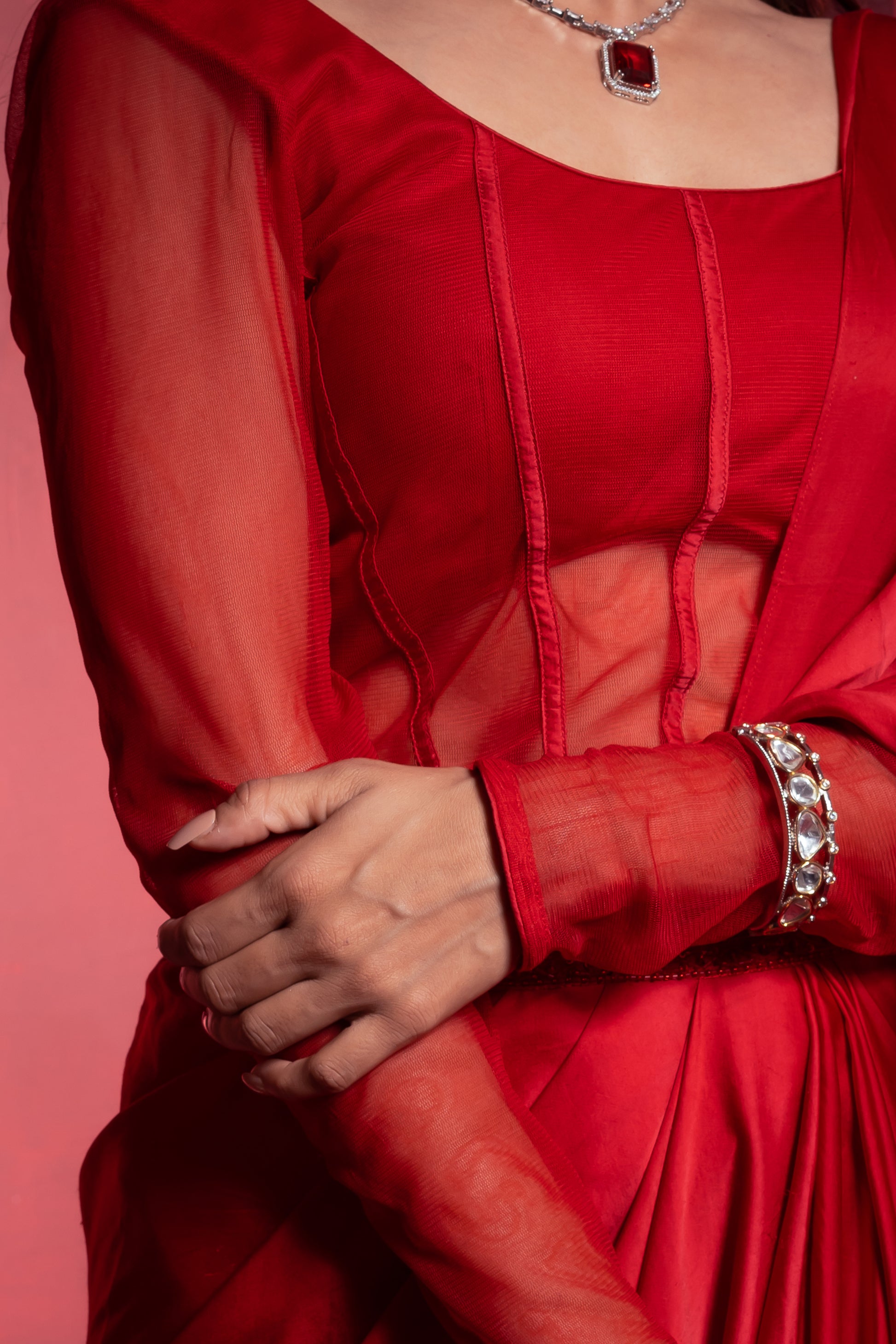 Crimson Red Draped Saree with full sleeves Blouse