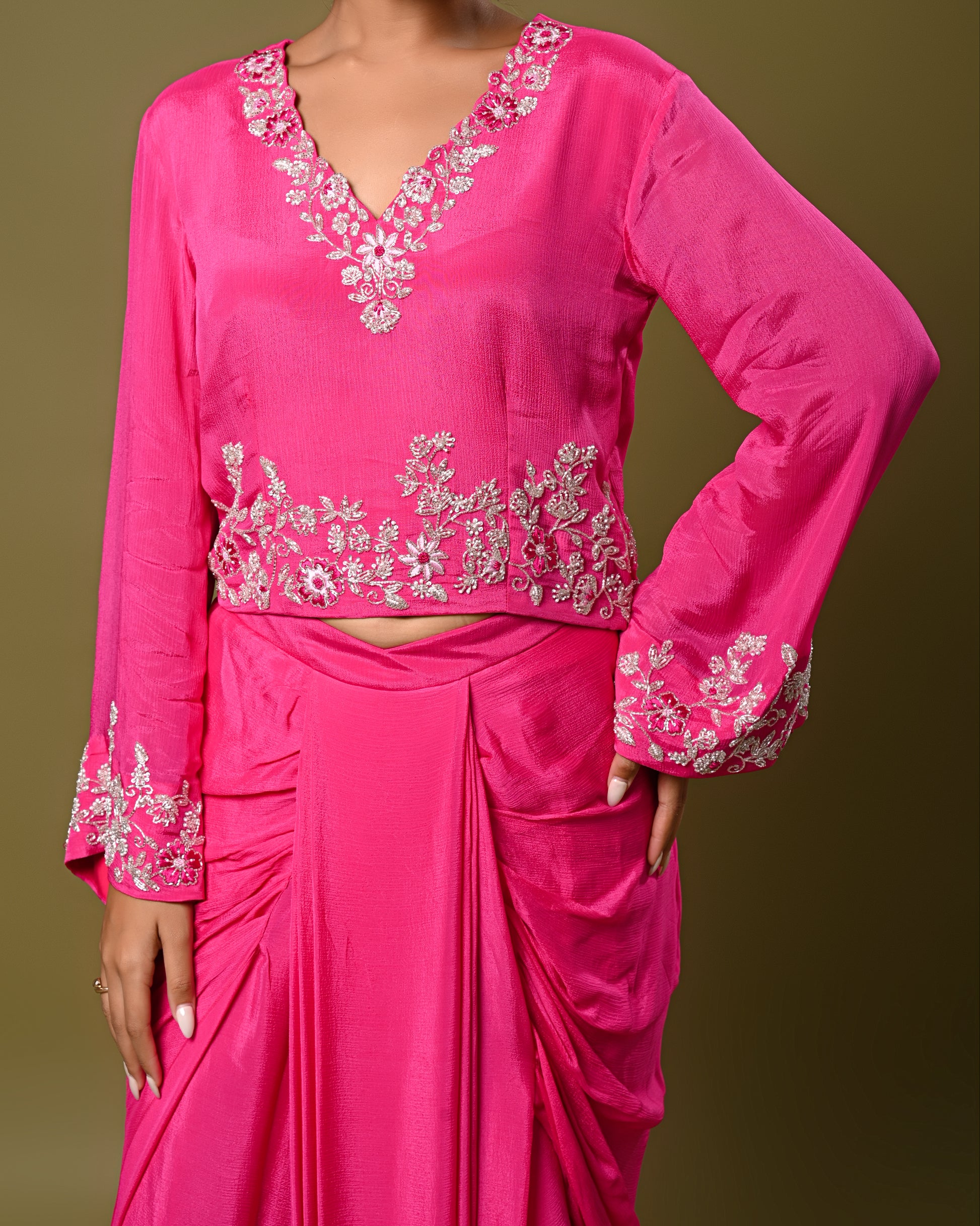 Grace meets glamour in this hot pink embroidered drape skirt set. The V-neck blouse features intricate silver floral embroidery on the neckline, sleeves, and waist, paired with a pre-draped skirt that adds a modern twist to traditional elegance. Perfect for festive occasions, weddings, or celebrations.