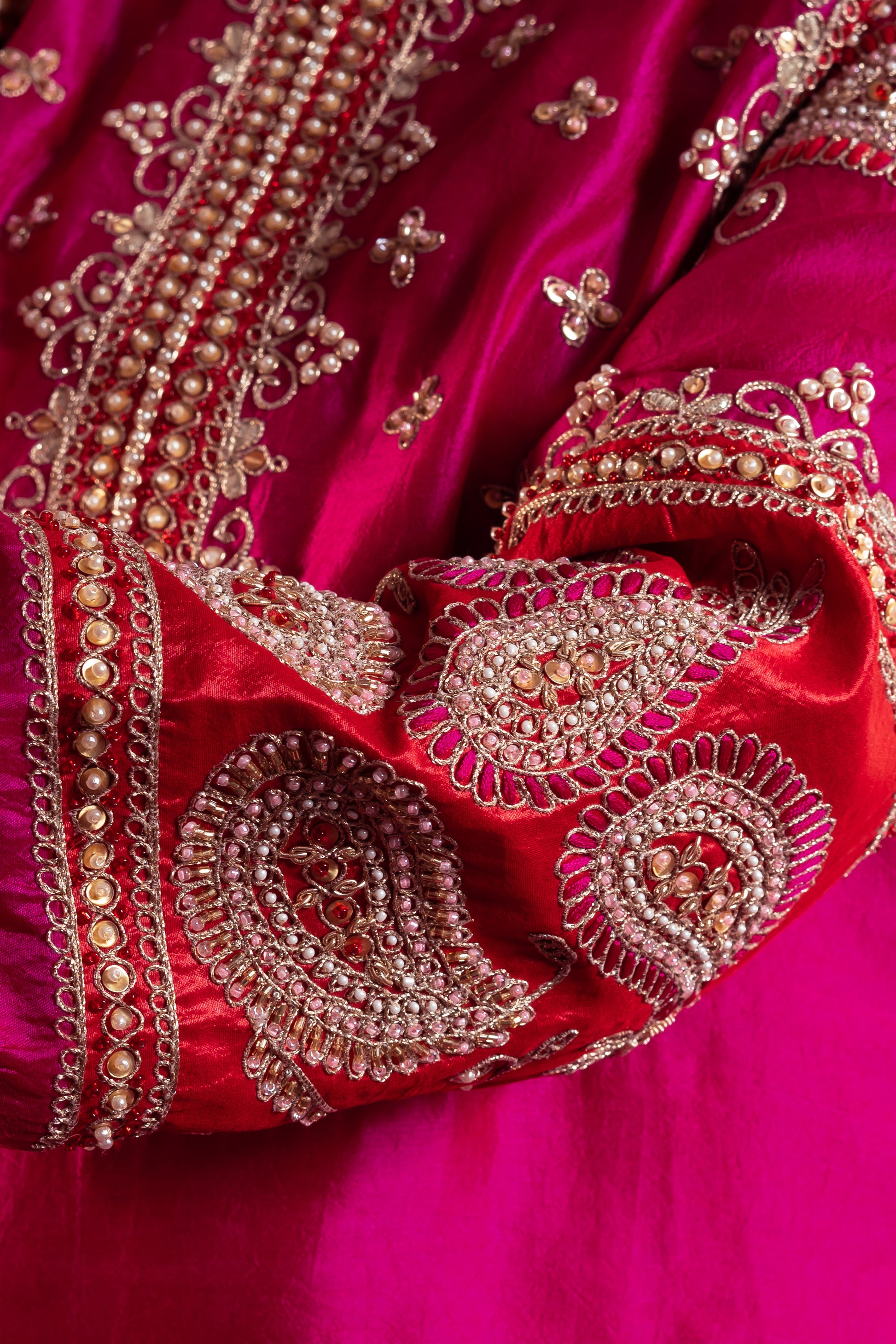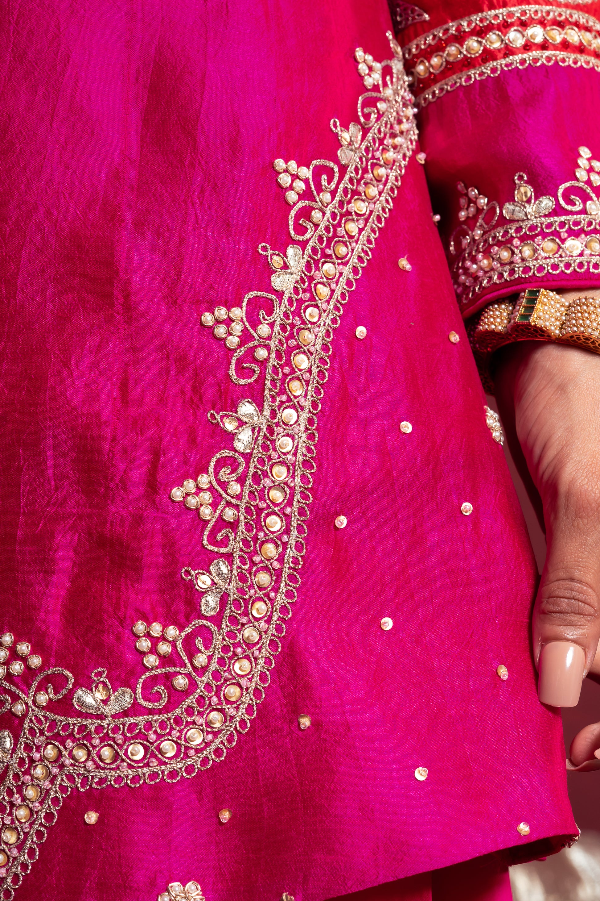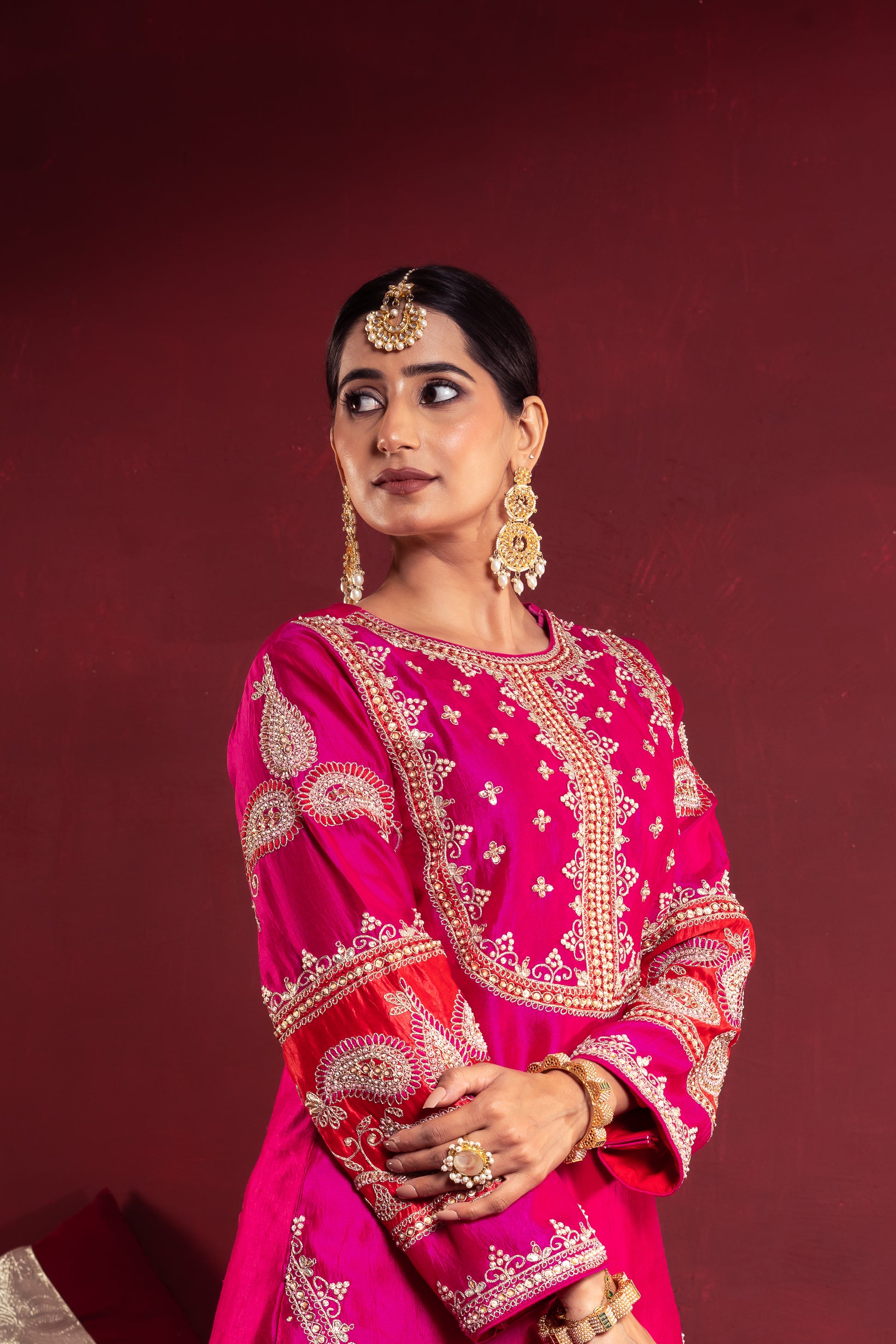 A stunning magenta pink sharara suit set adorned with intricate zari and thread embroidery, perfect for festive and wedding occasions. The rich detailing on the neckline and sleeves adds a regal touch, while the soft flowy fabric ensures all-day comfort and elegance. Paired with a matching embroidered dupatta, this ensemble radiates traditional charm with modern sophistication.