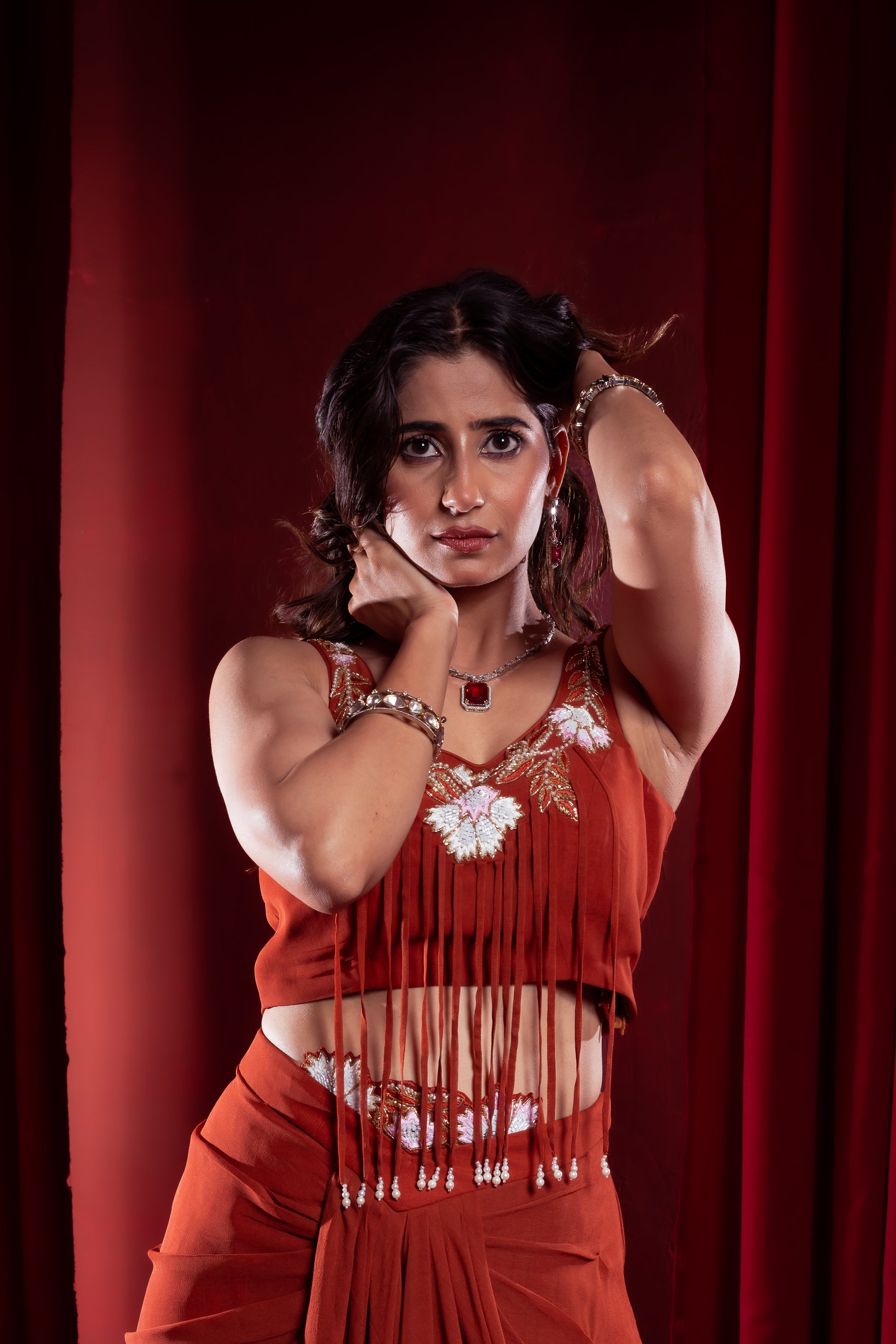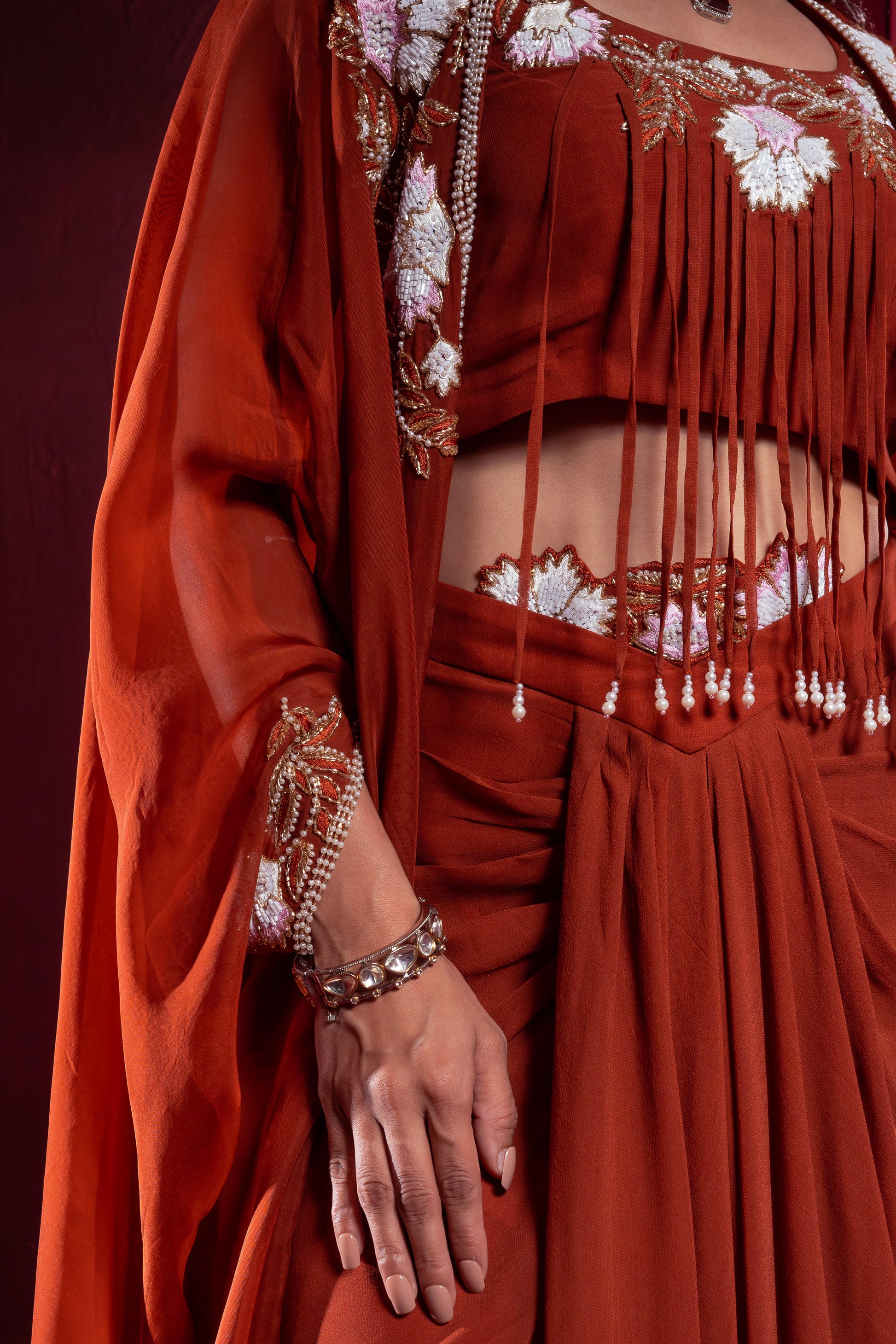 Elevate your festive style with this elegant rust orange layered dress featuring a beautifully embroidered cape. The flowy silhouette, delicate detailing, and rich hue make it a perfect choice for weddings, festive occasions, and evening gatherings.