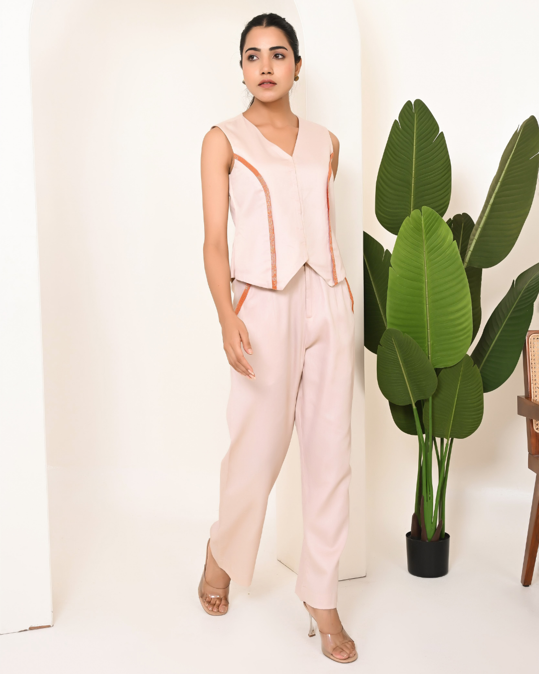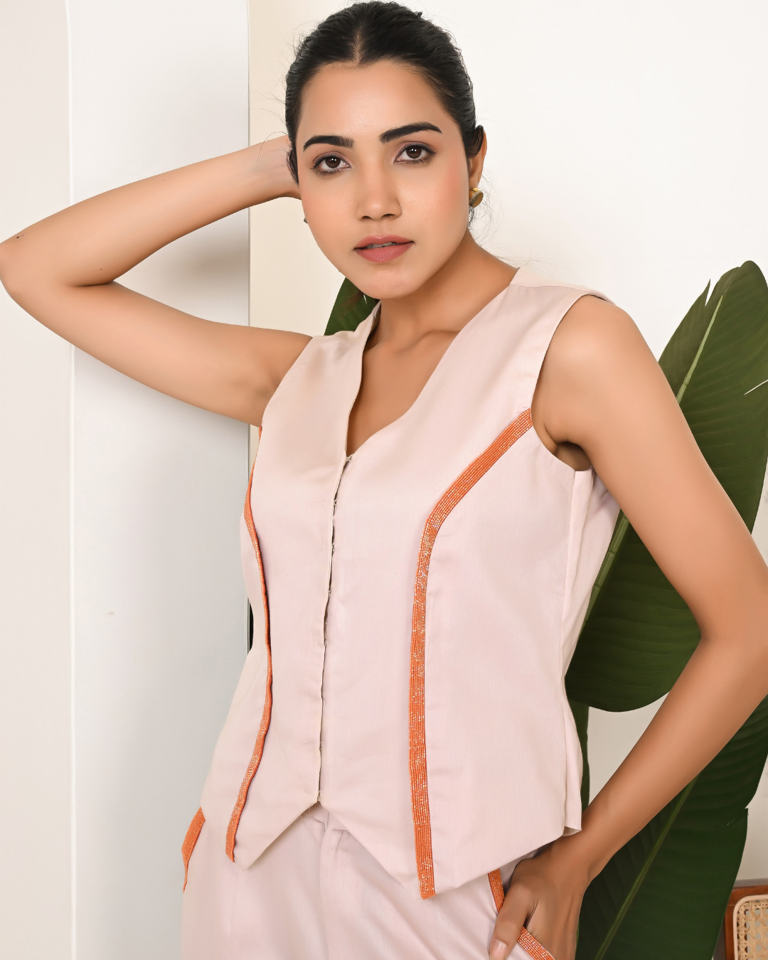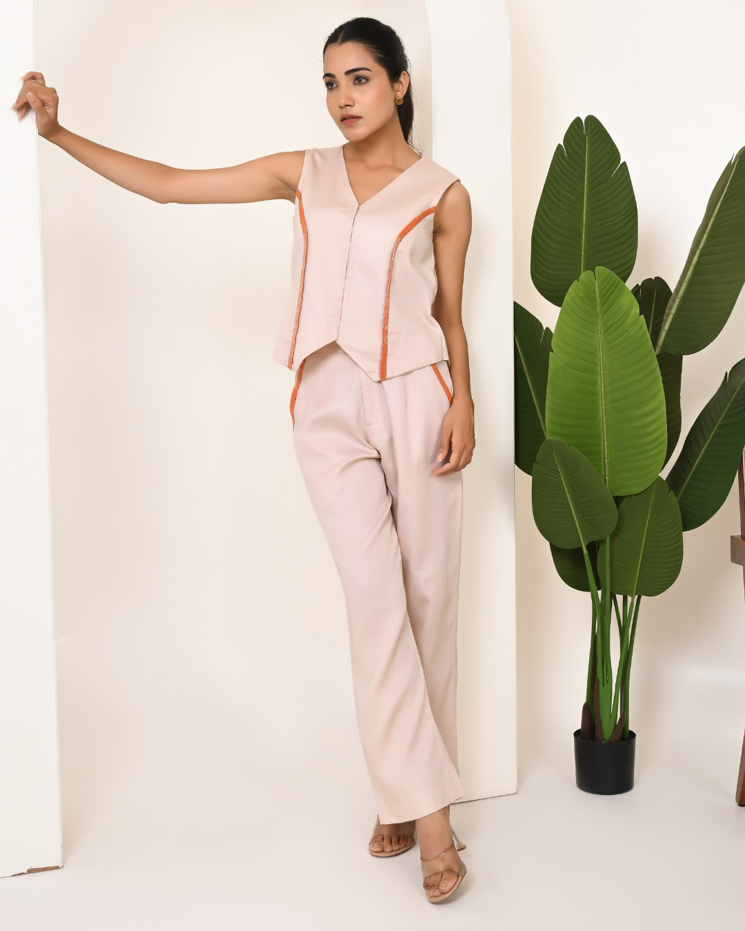 Radiate confidence and style with the Beige Waist Coat Cord Set - a chic and sophisticated outfit that will have you turning heads wherever you go.
