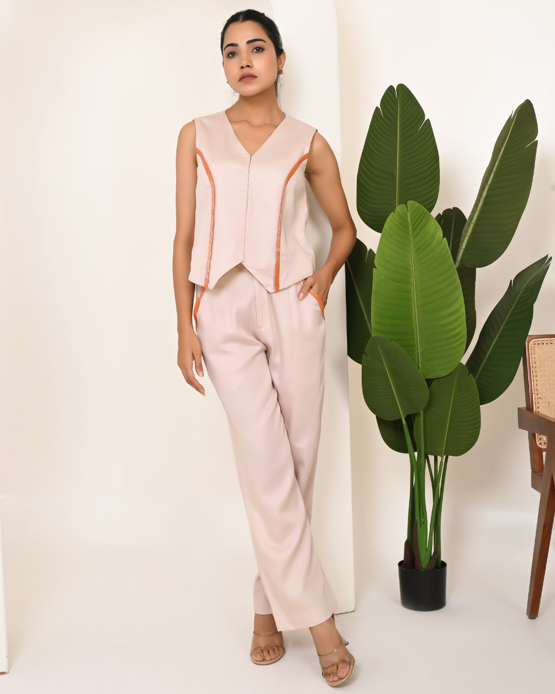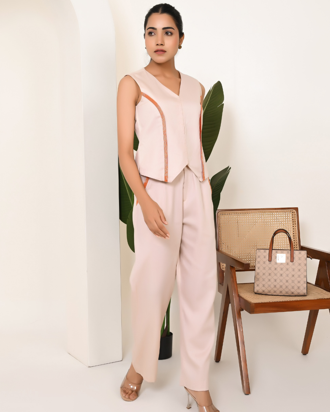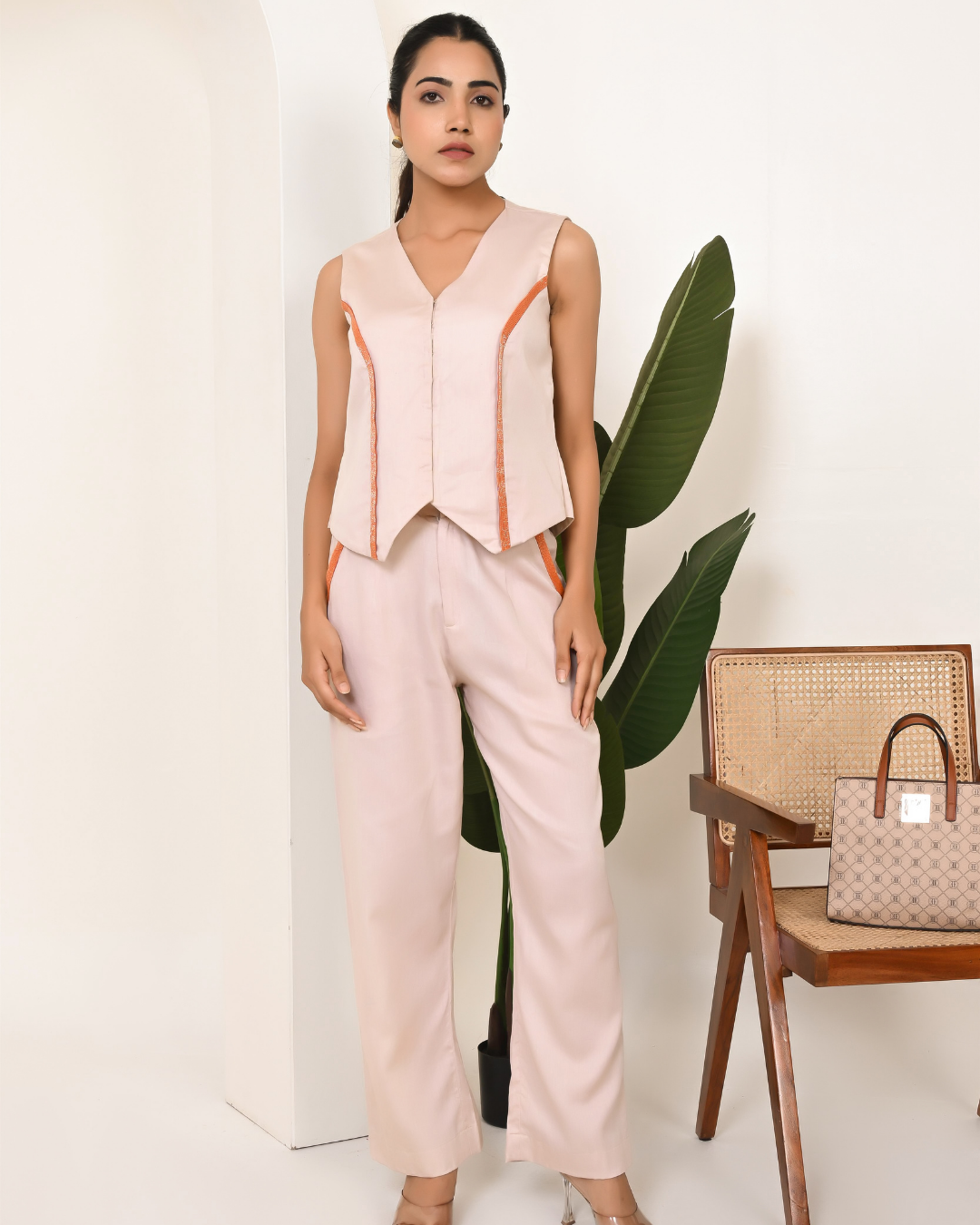 Radiate confidence and style with the Beige Waist Coat Cord Set - a chic and sophisticated outfit that will have you turning heads wherever you go.