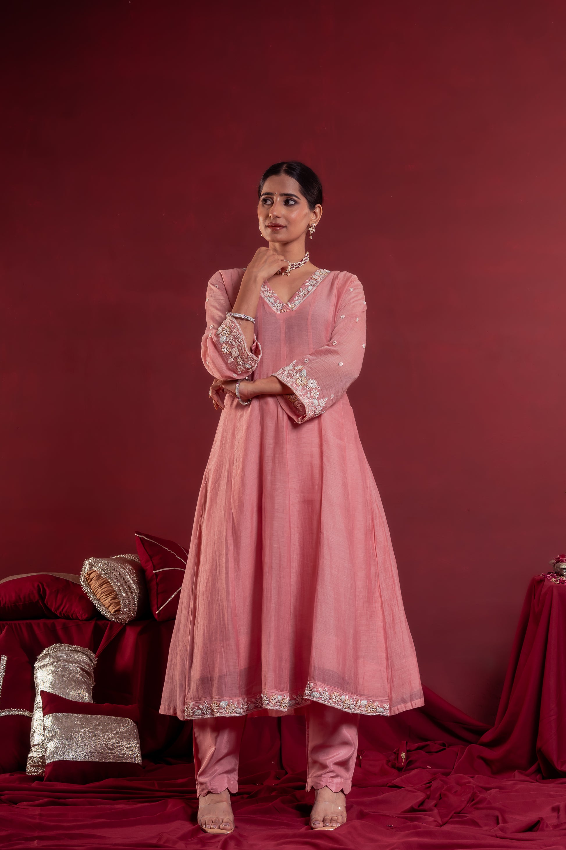 Graceful and timeless, this blush pink Anarkali set features delicate floral embroidery on the neckline, sleeves, and hemline. Crafted from a soft, flowy fabric that enhances your silhouette, it’s perfect for festive occasions, traditional functions, and elegant gatherings.